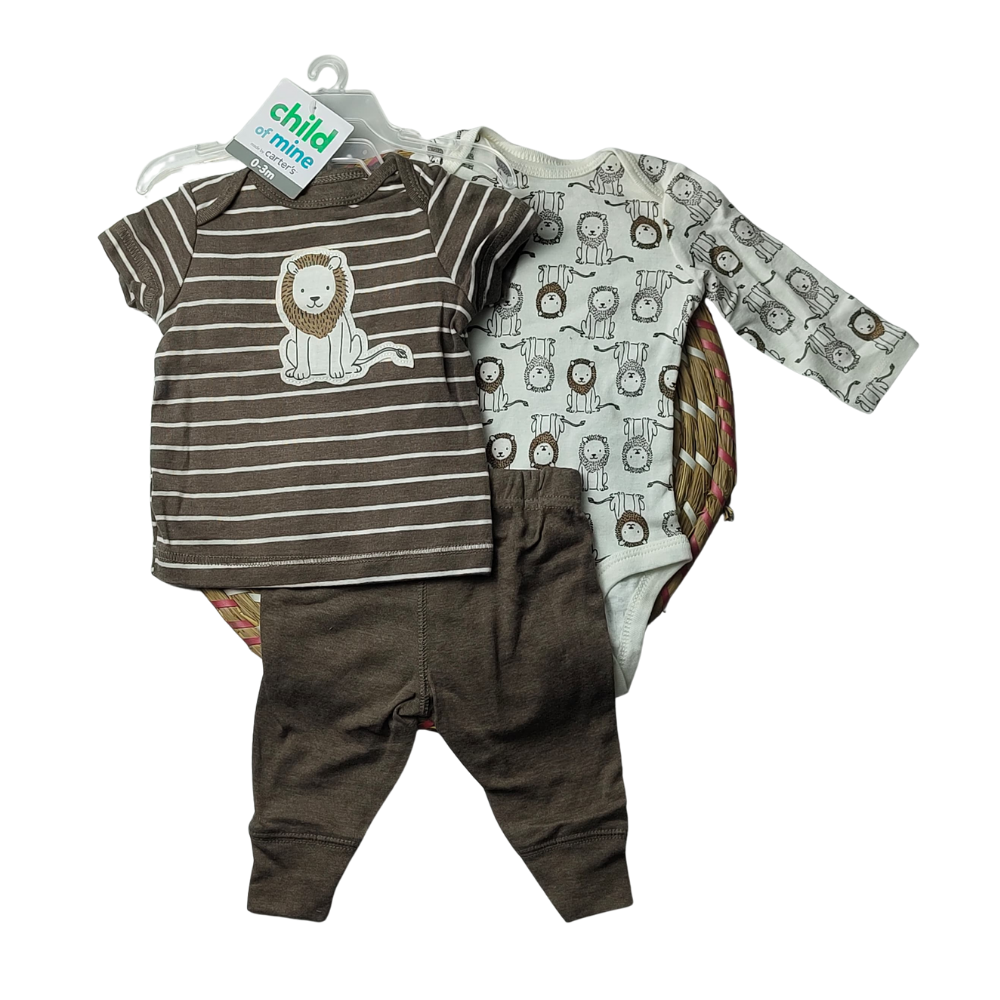 Bring playful jungle vibes to your baby boy’s wardrobe with this 3-piece set from Child of Mine by Carter’s. Featuring a striped lion print tee, a long-sleeve bodysuit with all-over lion prints, and matching soft pants, this set offers comfort, cuteness, and versatility.
