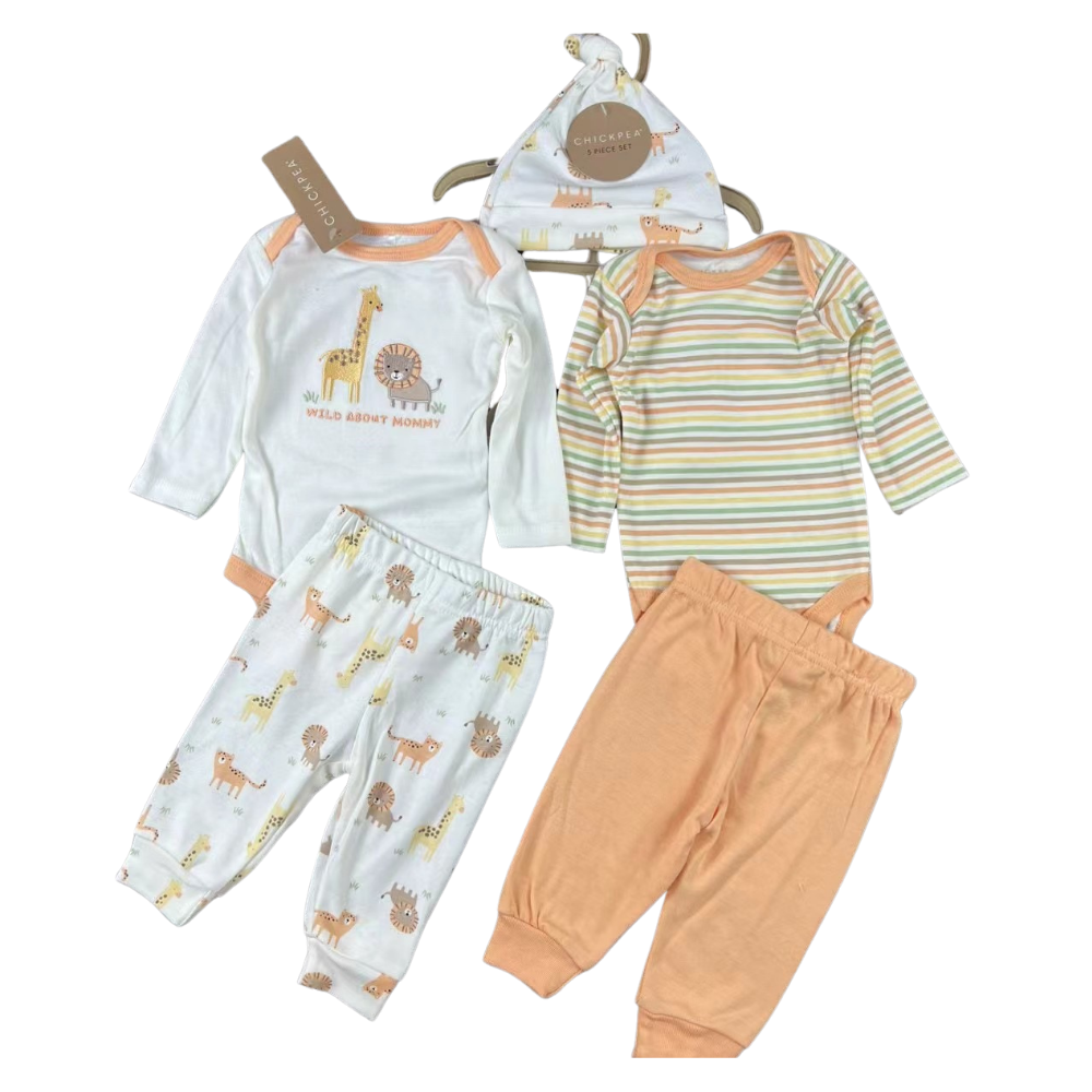 5-piece unisex baby outfit set with safari theme. Includes bodysuits, pants, and a hat. Soft cotton, neutral design, perfect for gifting or everyday wear.