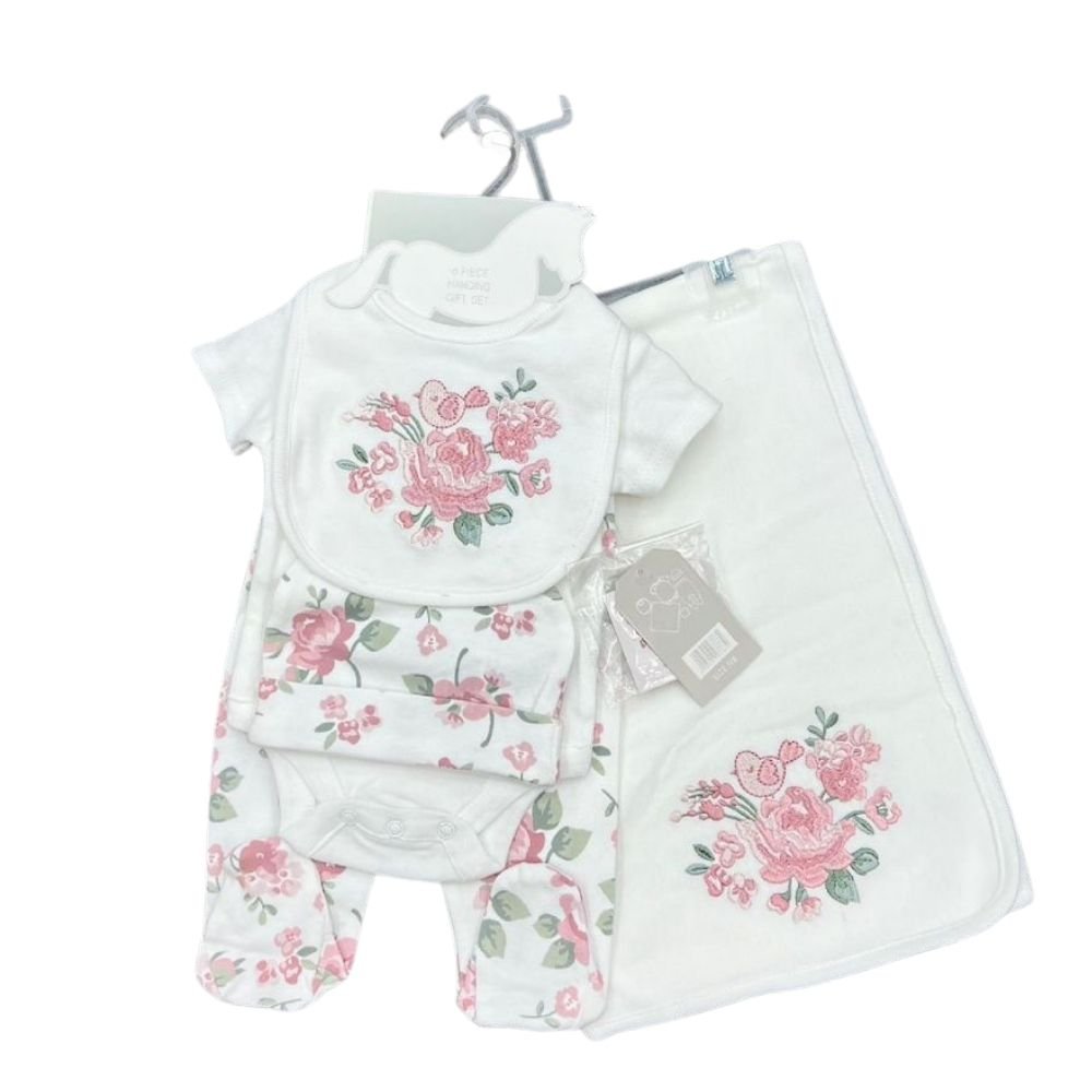 Welcome your little princess with this 5-piece baby girl floral embroidery gift set. Designed in soft cotton with delicate pink floral prints and embroidery, this set includes everything needed for everyday comfort and style. Perfect for gifting, it combines practicality with elegance for newborns.