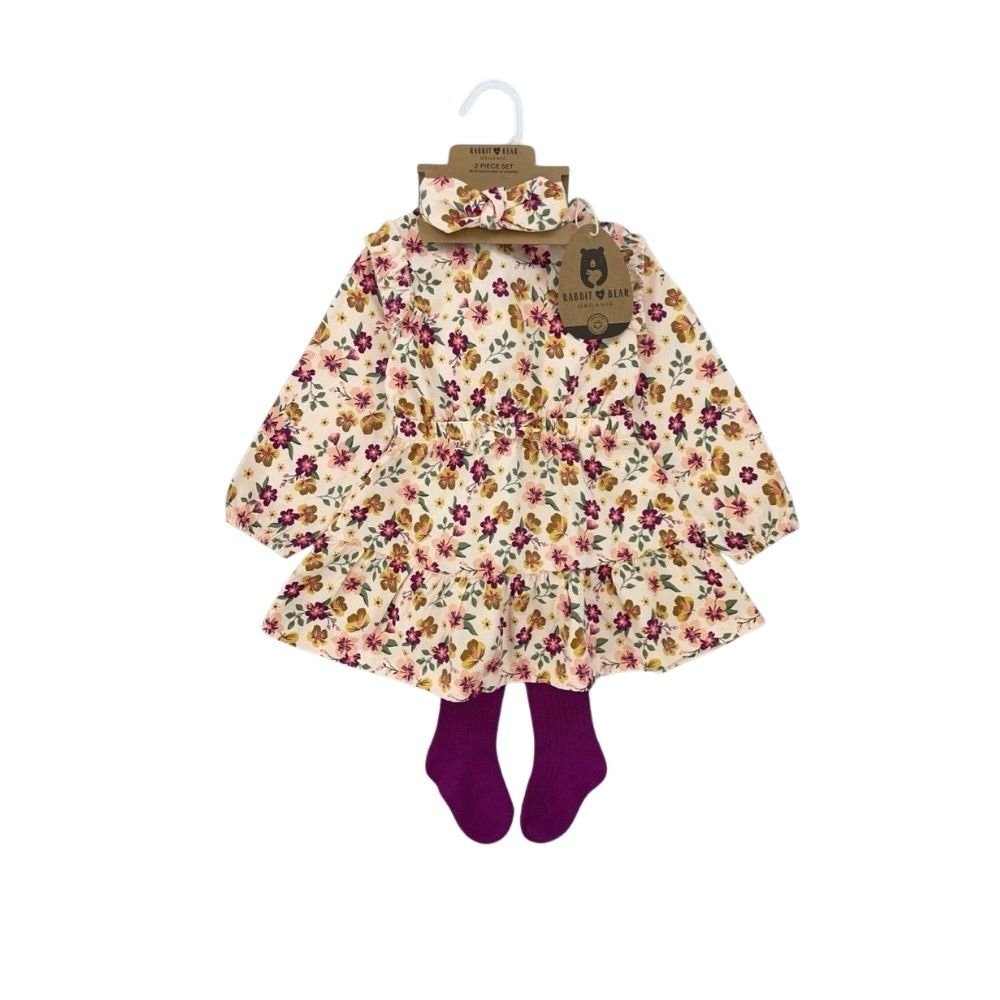 Let your little princess shine with this 3-piece floral dress set from Rabbit Bear. Designed with vibrant blooms and charming details, this outfit combines comfort and elegance for special days and everyday wear. The soft ruffle dress, matching bow headband, and cozy tights make it a complete and adorable look.