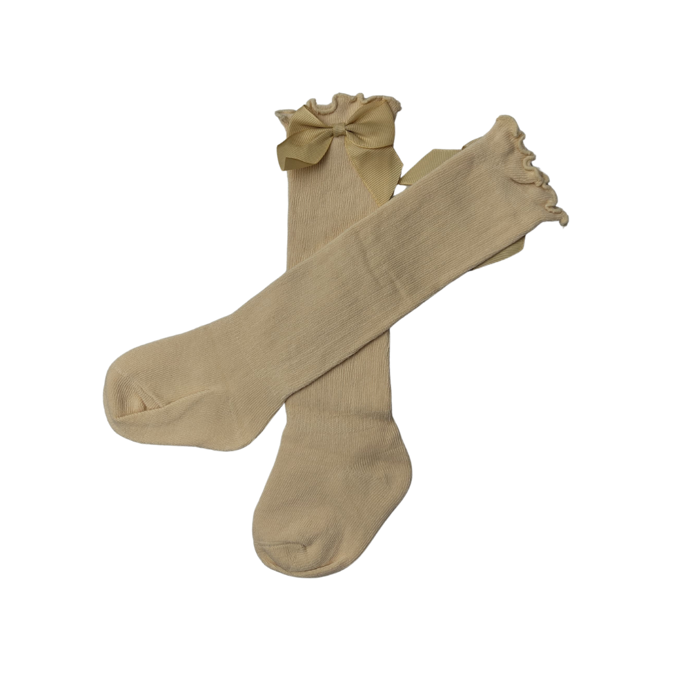 Baby Girl Knee-High Socks – Beige with Bow & Ruffle Edge