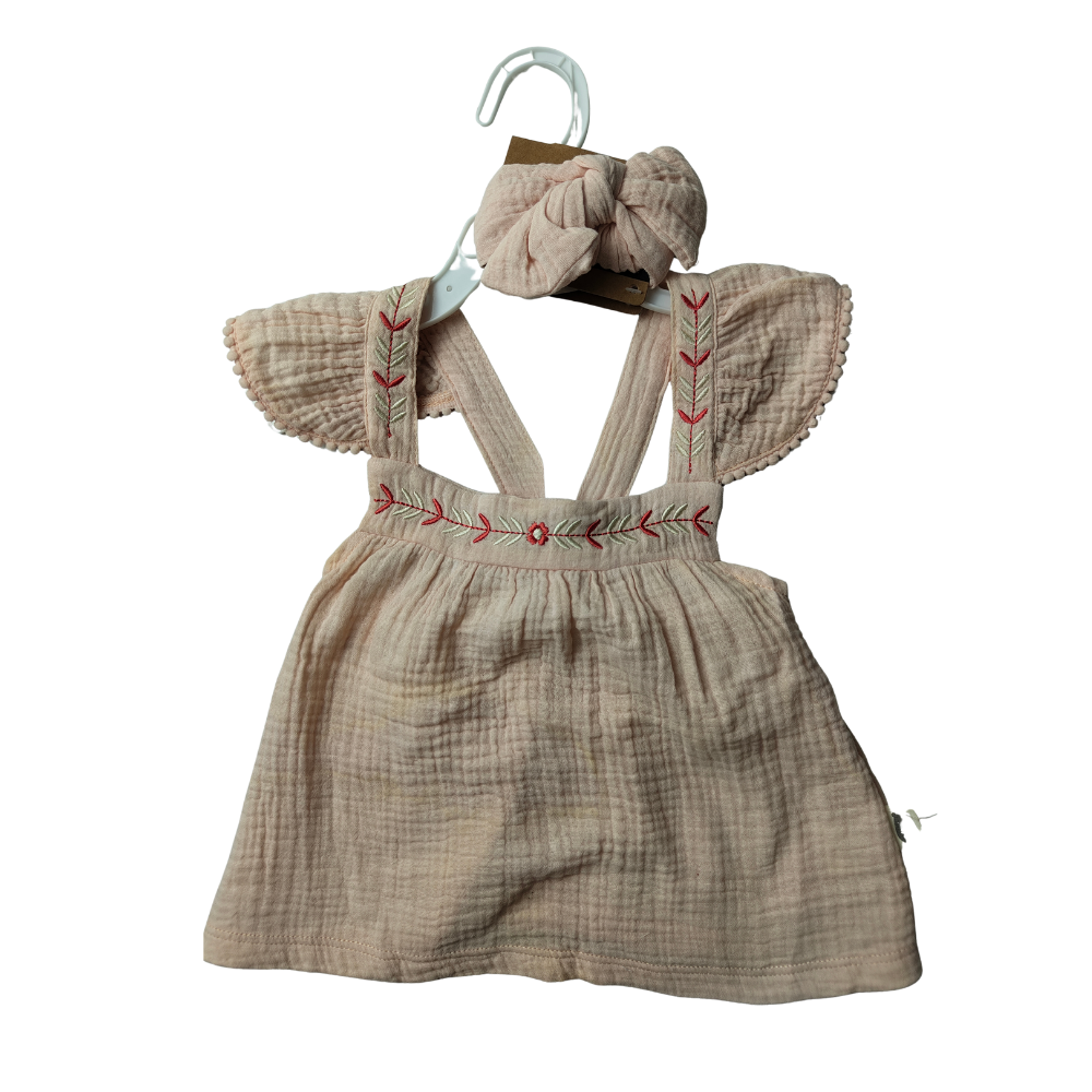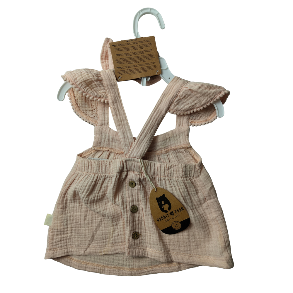 Made from organic cotton muslin, this outfit is soft, breathable, and perfect for warm weather. The embroidered back straps add a playful touch, while the elastic waistband ensures a snug and flexible fit. Ideal for everyday wear, outings, or gifting.