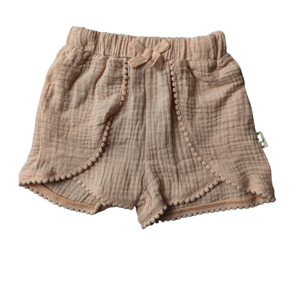 Adorable baby girl peach outfit by Rabbit Bear Organic. Includes cross-back ruffle top & matching pom-trim shorts in soft muslin cotton. Sizes 12, 18 & 24 months.