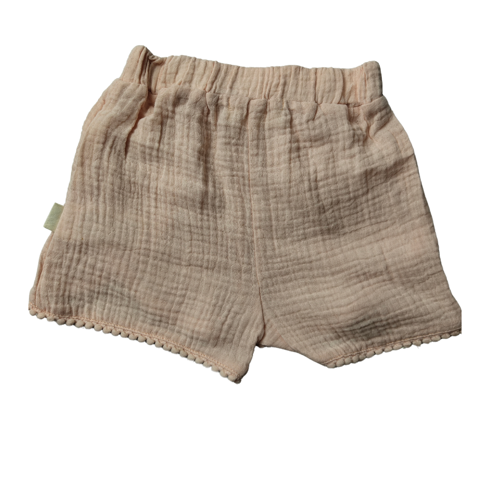 Keep your little one stylish and comfy in this 2-piece peach muslin cotton set from Rabbit Bear Organic. The set includes a cross-back ruffle top with wooden button details and matching shorts with pom-pom lace trims and a bow accent.