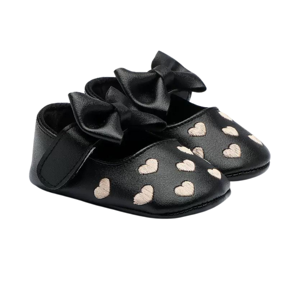 Baby Girl Shoes – Black Bow with Heart Print, First Walker 6–18 Months