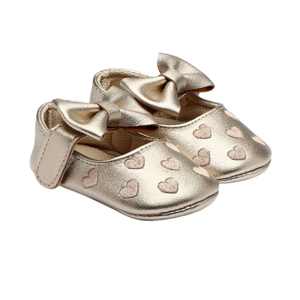 Shop elegant baby girl shoes in gold with bow & heart prints. Soft sole shoes for crawlers and early walkers (6–18 months). Perfect gift for stylish little ones – EpicToto.