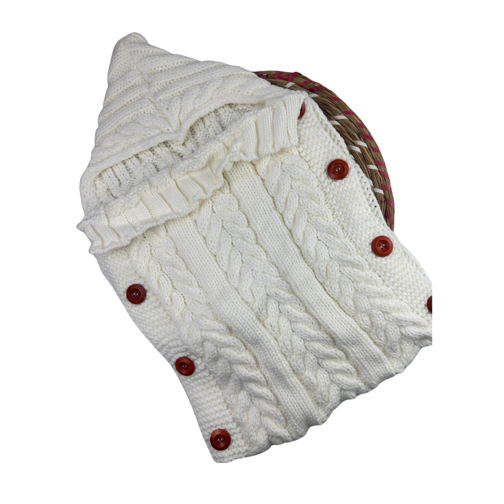 Keep your baby cozy and warm with this knitted baby sleeping bag in elegant white. Designed with a hoodie for extra warmth and button closures for easy use, this swaddle sack is perfect for cooler days and nights. The thick cable-knit design provides a stylish look while offering comfort and security for your newborn.