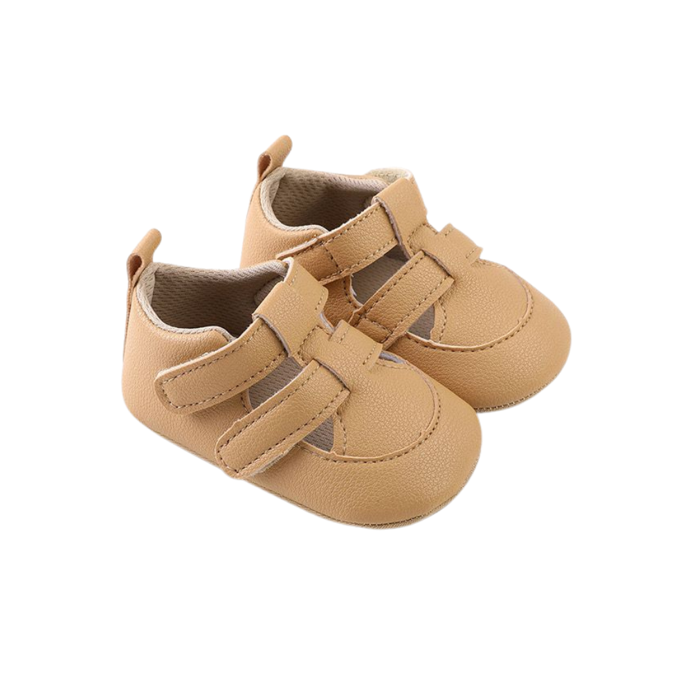 These tan baby shoes with double Velcro straps are a practical and stylish choice for babies aged 6–18 months. Designed with a soft, flexible sole that supports natural movement, they are perfect for crawlers and first walkers. The easy-to-use Velcro straps make them simple to put on and adjust, while the classic tan color pairs well with any outfit.