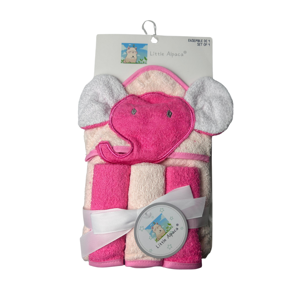 Baby Towel & Washcloth Set – 4-Piece Pink & White with Elephant Topper – Little Alpaca