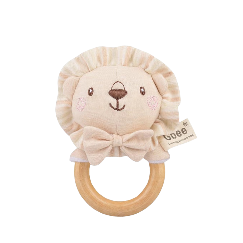 Beige Lion Baby Teething Ring Rattle Toy – Gbee | Natural Wooden Handle