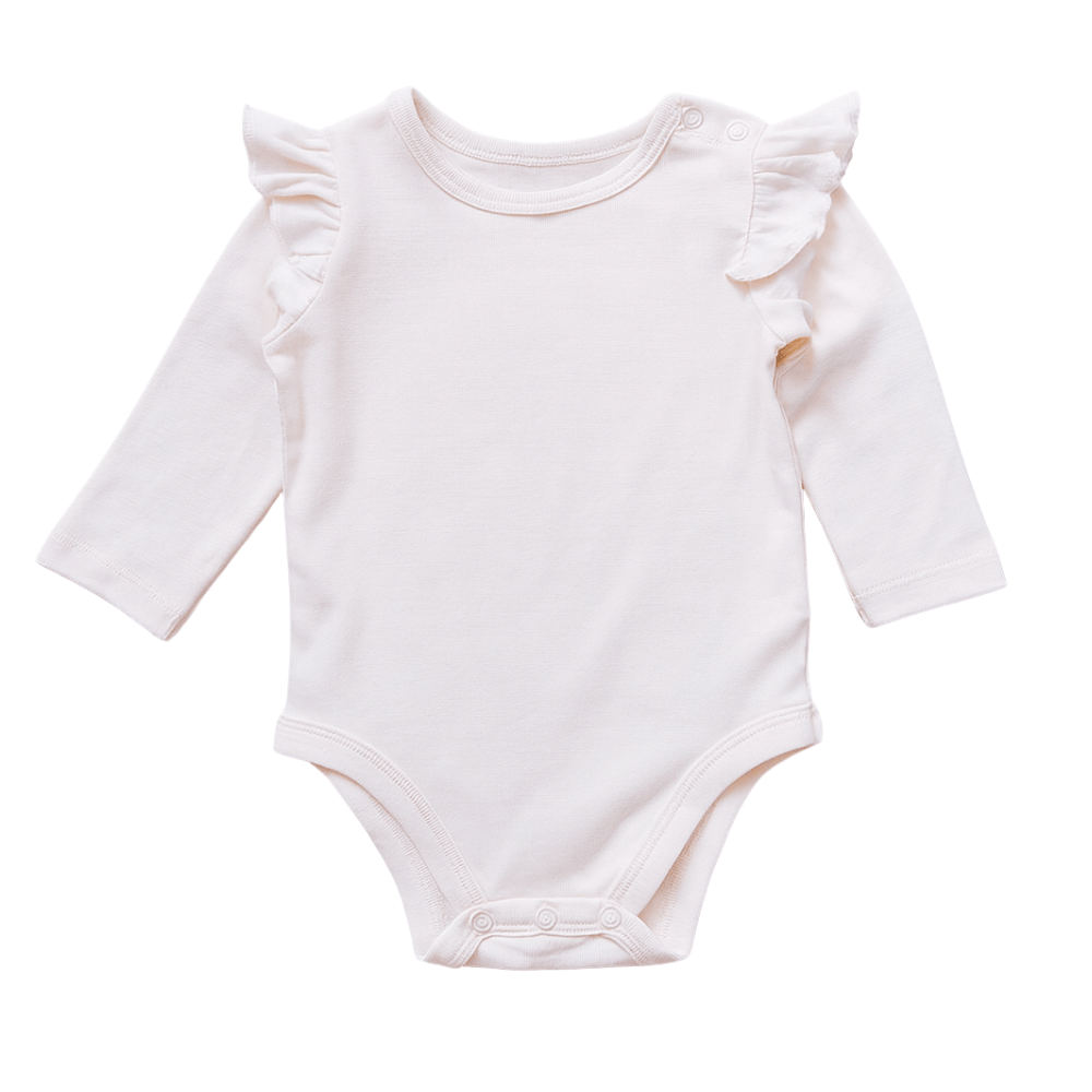 This adorable long-sleeve bodysuit in soft beige is a must-have for your baby girl’s wardrobe. Designed with delicate ruffle shoulders, it adds a sweet touch of style while keeping your little one comfortable. The neutral beige color makes it easy to pair with any bottoms or layer under dresses. Snap buttons at the shoulder and bottom ensure easy dressing and quick diaper changes.