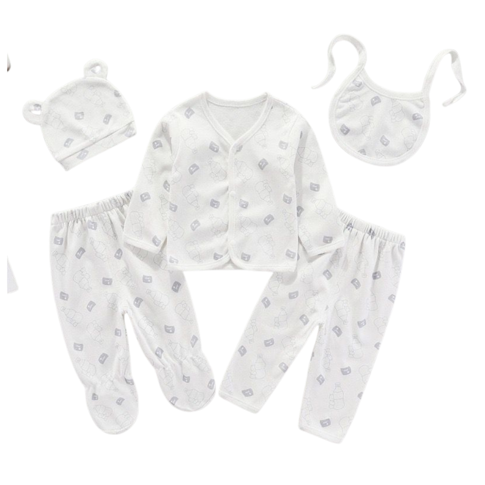 Keep your newborn cozy and adorable with this 5-piece clothing set featuring a soft white fabric with grey teddy bear & block prints. Designed for comfort, practicality, and cuteness, it’s perfect as a starter pack or a baby shower gift.