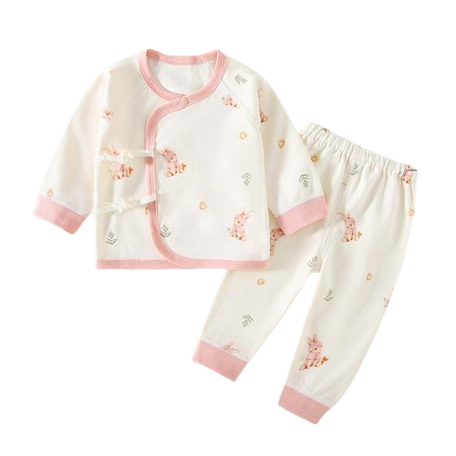 Dress your little one in cozy cuteness with the Kitovu 2-Piece Bunny Print Pajama Set. This charming outfit features a long-sleeve wrap-style top and matching pants, decorated with playful bunny and floral prints. The soft pink trims add a sweet finishing touch, making it perfect for baby girls.
